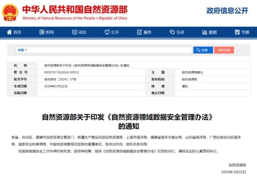 在数据分类分级管理方面,《办法》明确自然资源部组织制定自然资源领域数据分类分级、重要数据和核心数据识别认定、数据安全保护等标准规范,指导召开数据分类分级管理工作,编制行业重要数据和核心数据目录并实施动态管理。